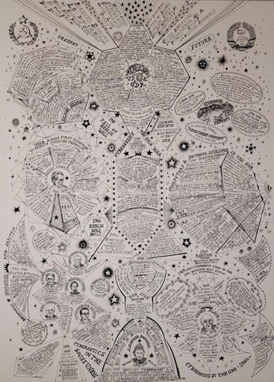 Ein Werk der britischen Künstlerin *Suzanne Treister* (geb. 1958) beschäftigt sich hingegen - in visueller Anlehnung an alchemistische Zeichnungen - mit der Geschichte von Kybernetik, Mikroelektronik und Computertechnologie in der DDR und der UdSSR während des Kalten Krieges. Treister schafft damit eine detailreiche Gegenerzählung zur klassischen Computergeschichte, die immer die USA ins Zentrum stellt.